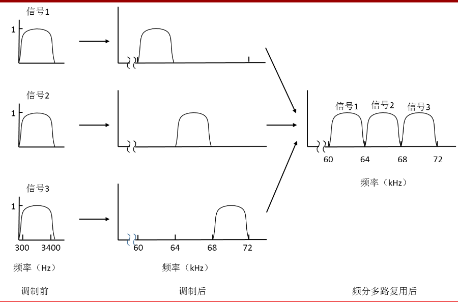 频分多路复用(FDM)的各用户占用不同的带宽资源,这里的带宽资源是频率带宽,不是数据的发送速率。用户在分配到一定的频带后,在通信过程中自始至终都占用这个频带。频率相互间是隔离开的。最常见应用是有线电视网络,频道嘛~~