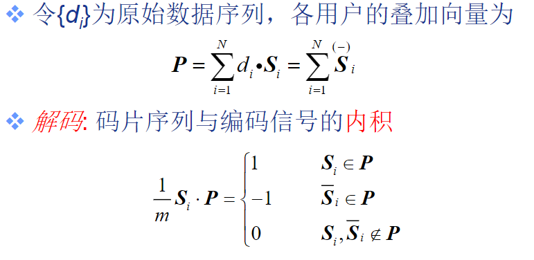 像上面得例子中的解码部分,假如我想接受si数据,就拿si的码和叠加向量进行内积运算,如果得到运算结果为1,p里有si的码,si发送了一个比特1。如果是0,意味着叠加序列里没有si和si的反码,也就是这段时间内这位用户木有发送数据。