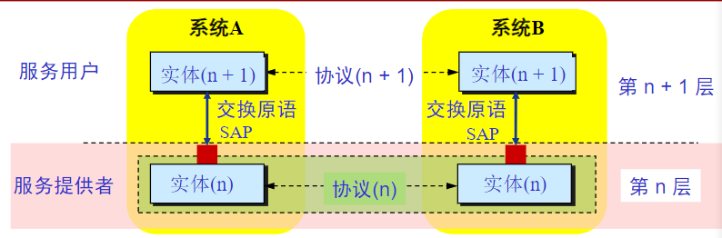 - 同系统的相邻层实体间通过接口进行交互,通过服务访问点SAP,交换原语,指定请求的特定服务。