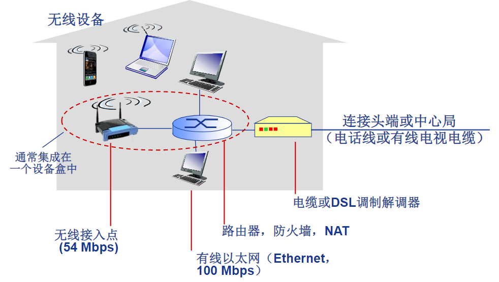 - 无线接入网络,通过共享的无线接入网络连接系统与路由器。无线接入网络分为无线局域网(LANs),也就是我们常用的WiFi;广域无线接入,通过蜂窝网提供商运营的基站来发送和接收分组,接入范围在几十公里,也就是我们常用的4G。
