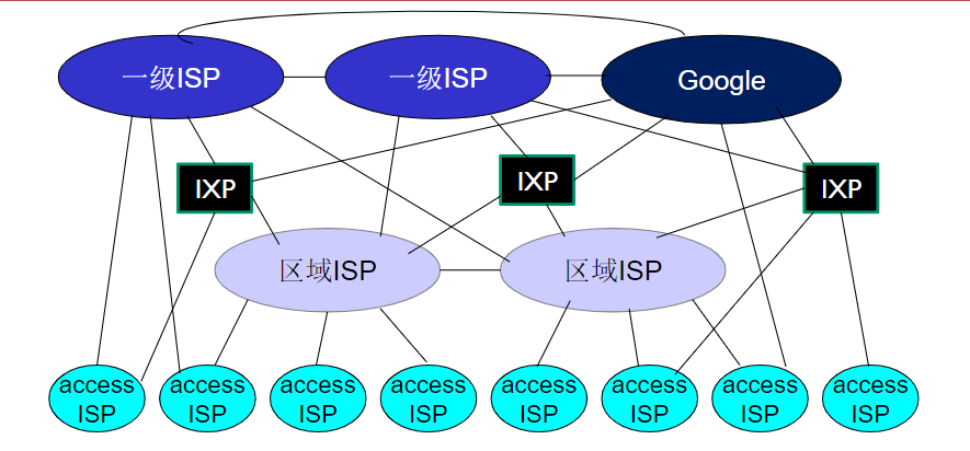 主机/端系统接入ISP连接到Internet,整个Internet有很多的接入ISP互连构成复杂的网络互联的网络。这些主机是不会两两直接互联的,效率不高也不现实;也不是靠接入ISP连接到一个国家或全球ISP实现互联,这和国家利益与实力冲突。但是这些ISP网络必须互联才能实现通信。我们可以用大量的IXP交换节点和建立区域网络连接接入ISP和运营商ISP。除此之外,还有一些内容提供商网络如Google会运行自己的网络,并直接就近为用户提供服务、内容。