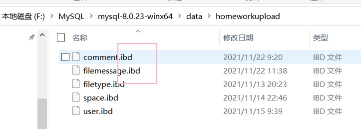 然后进入那个文件夹,随便进入一个数据库文件夹,可以看到许多后缀名为.idb的文件,也就是说我建表的时候使用的是innodb的引擎。