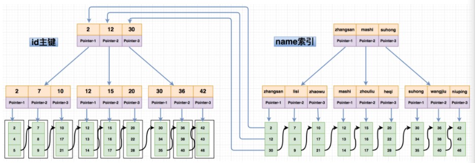 非聚簇索引:也叫二级索引。虽然关键字也保存在B+树的每个分支节点上,但叶节点不保存关键字,而是保存主键值。使用二级索引查询数据时,首先查询数据对应的主键,然后根据主键查询特定的数据行。如下图所示: