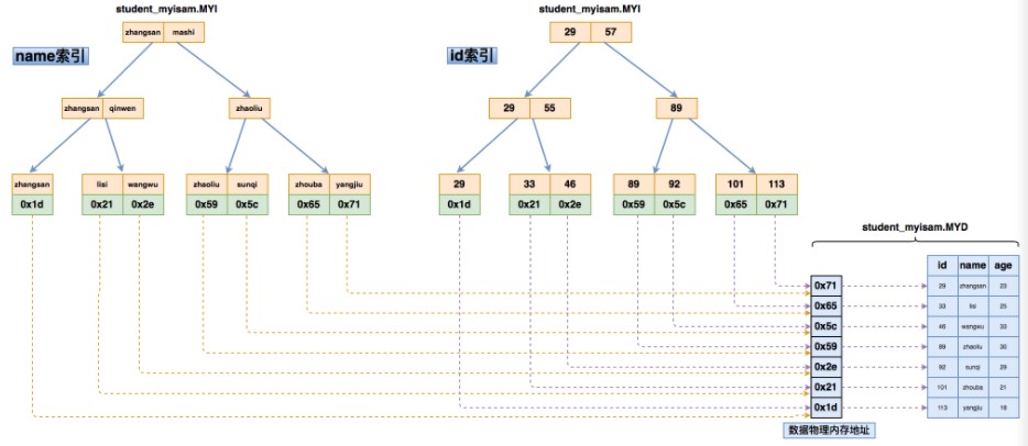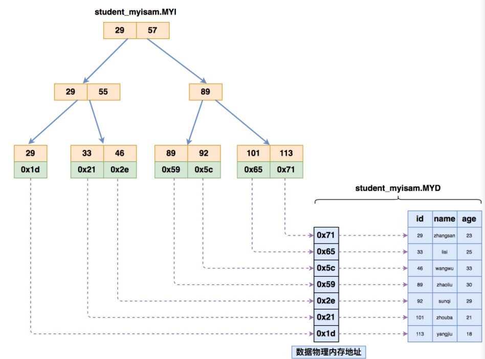 使用MyISAM存储引擎时,索引和数据单独分开存储,索引结构B+树最终指向数据的物理地址,而不是特定数据。需要根据数据文件(*.myd)的物理地址查找特定数据。(我看到网上很多很多其他博客说M有ISAM使用的非聚簇索引,但是我学习了一下,感觉还是有区别的呀。)
