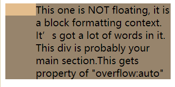 ② 实现更好的==自适应布局效果==(BFC阻止元素被浮动元素覆盖) 左边是浮动元素的话,就是固定宽度的,如果不触发BFC,那就是文字浮动的效果,触发后右边是呈现自适应的效果,可以随着父元素的宽度改变或者浮动元素大小的改变而改变,自动填满剩余的空间。如下图,右边的文字是形成了自己的封闭空间的。